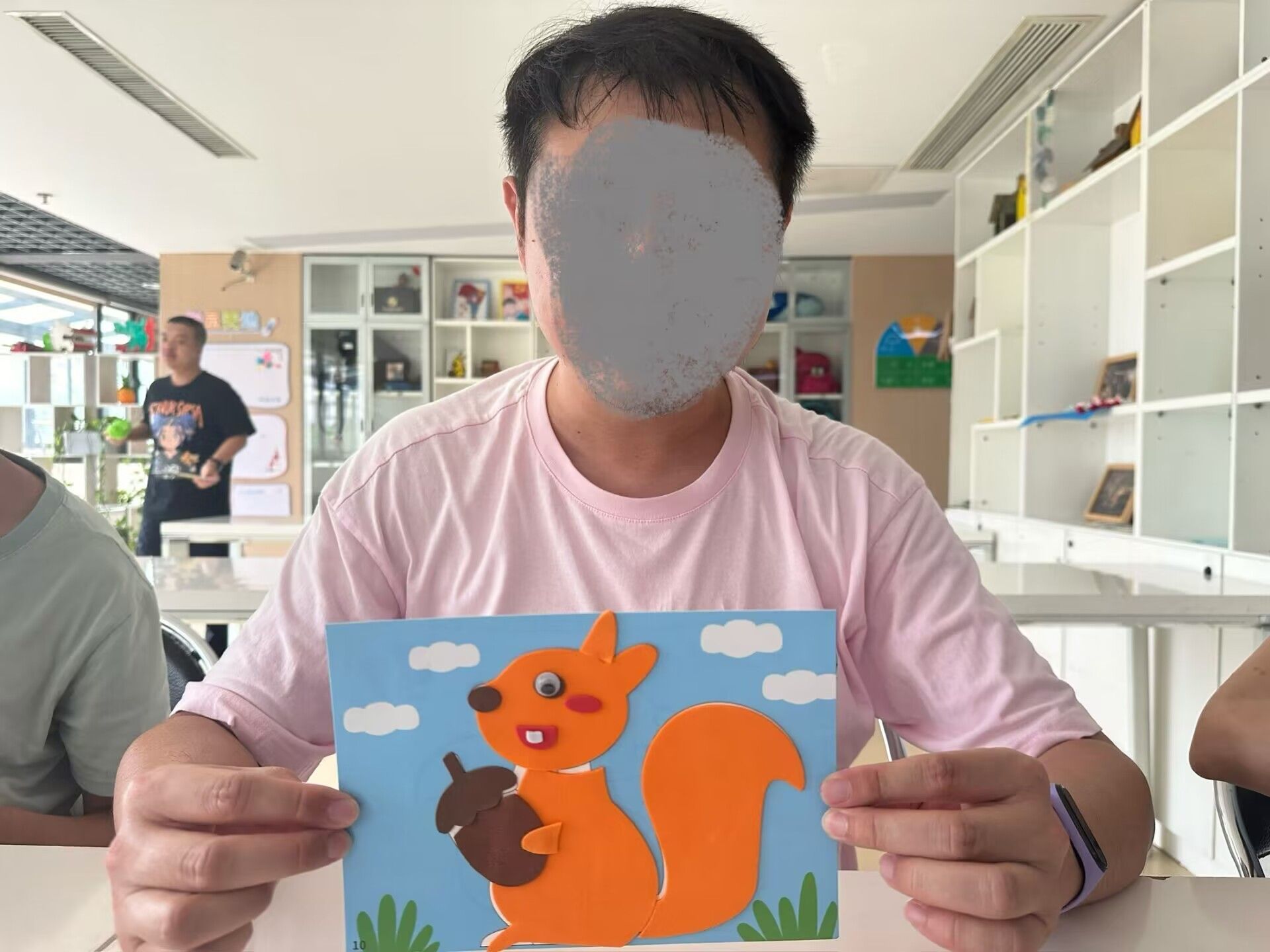 手工制作是最受学员们喜爱的环节。志愿者们引导学员们制作贴纸画,利用彩纸、剪刀、胶水等材料,亲手制作自己喜欢的动物拼贴画。在志愿者的耐心指导下,他们或剪或粘,小心翼翼地完成着每一个步骤。虽然他们的动作略显笨拙,但那份认真与专注却让人动容。当一幅幅色彩绚丽,灵活涌现的作品呈现在大家面前时,每个学员的脸上露出了自豪与喜悦的笑容。