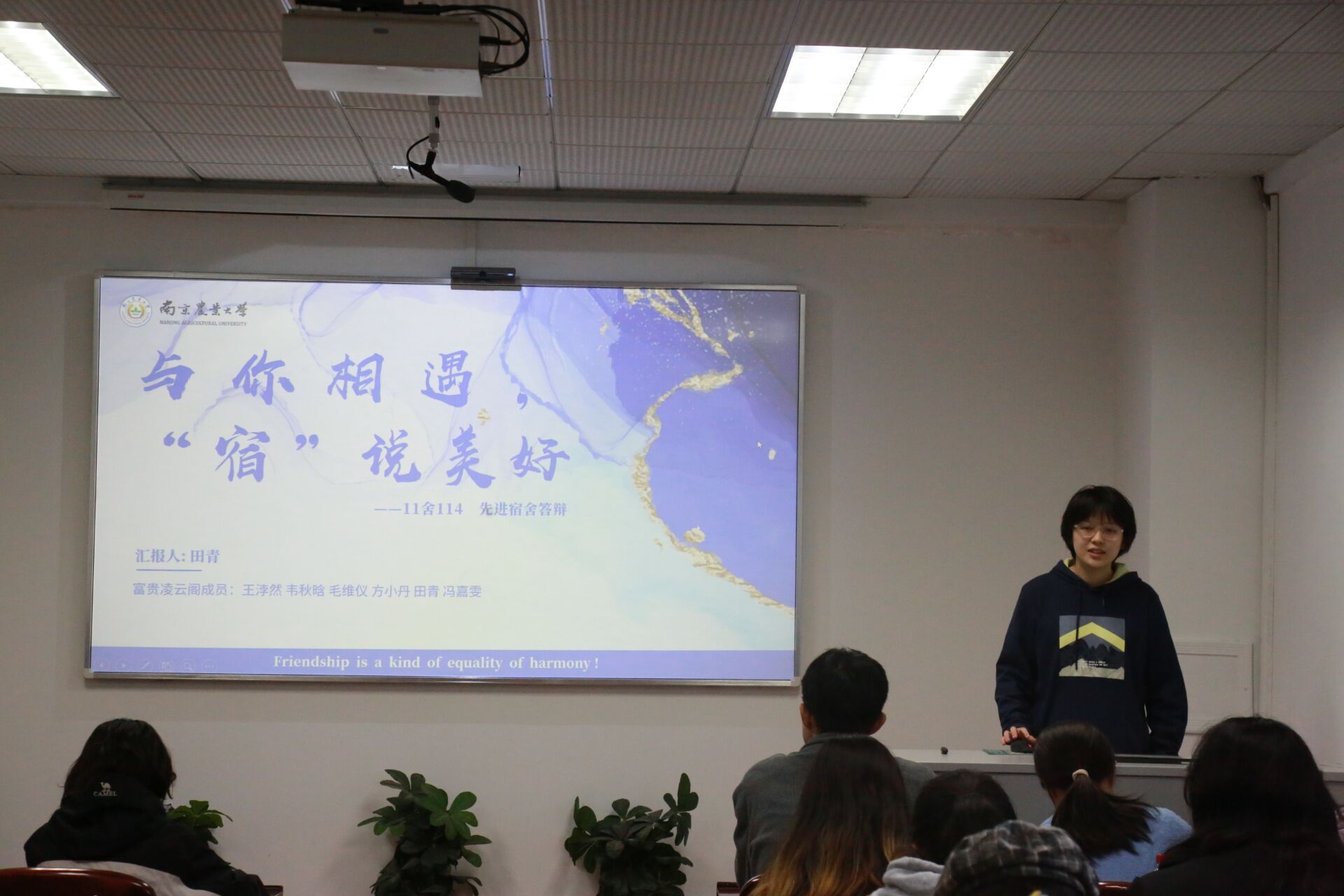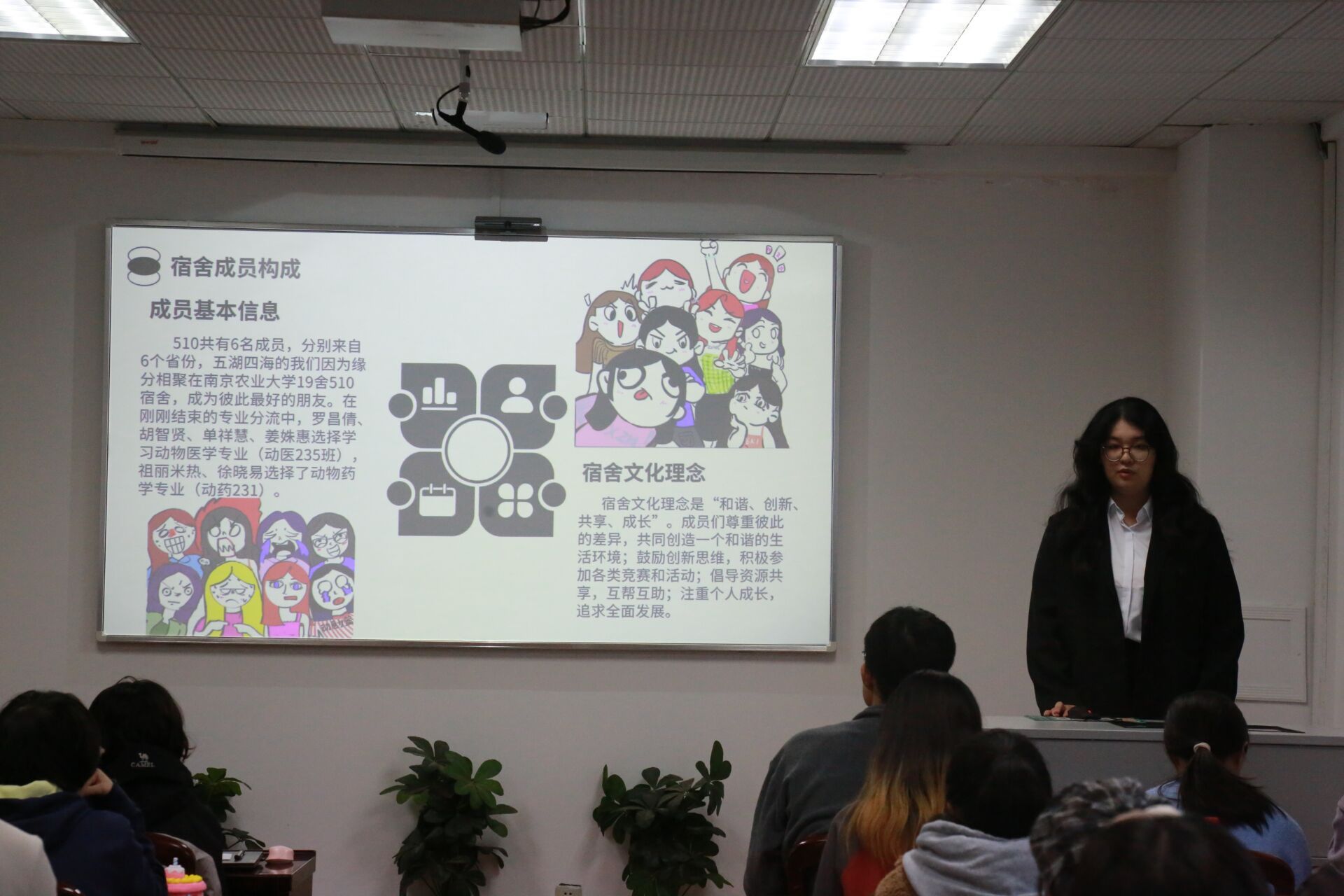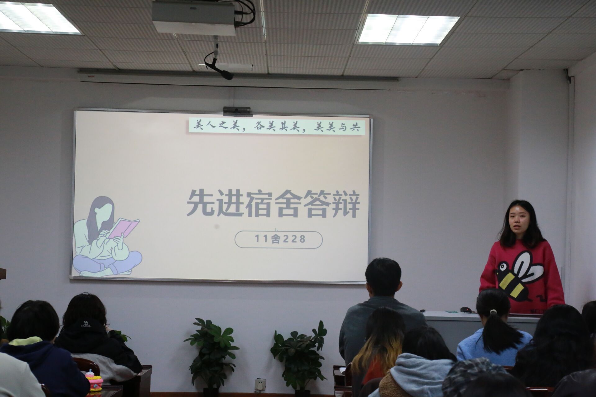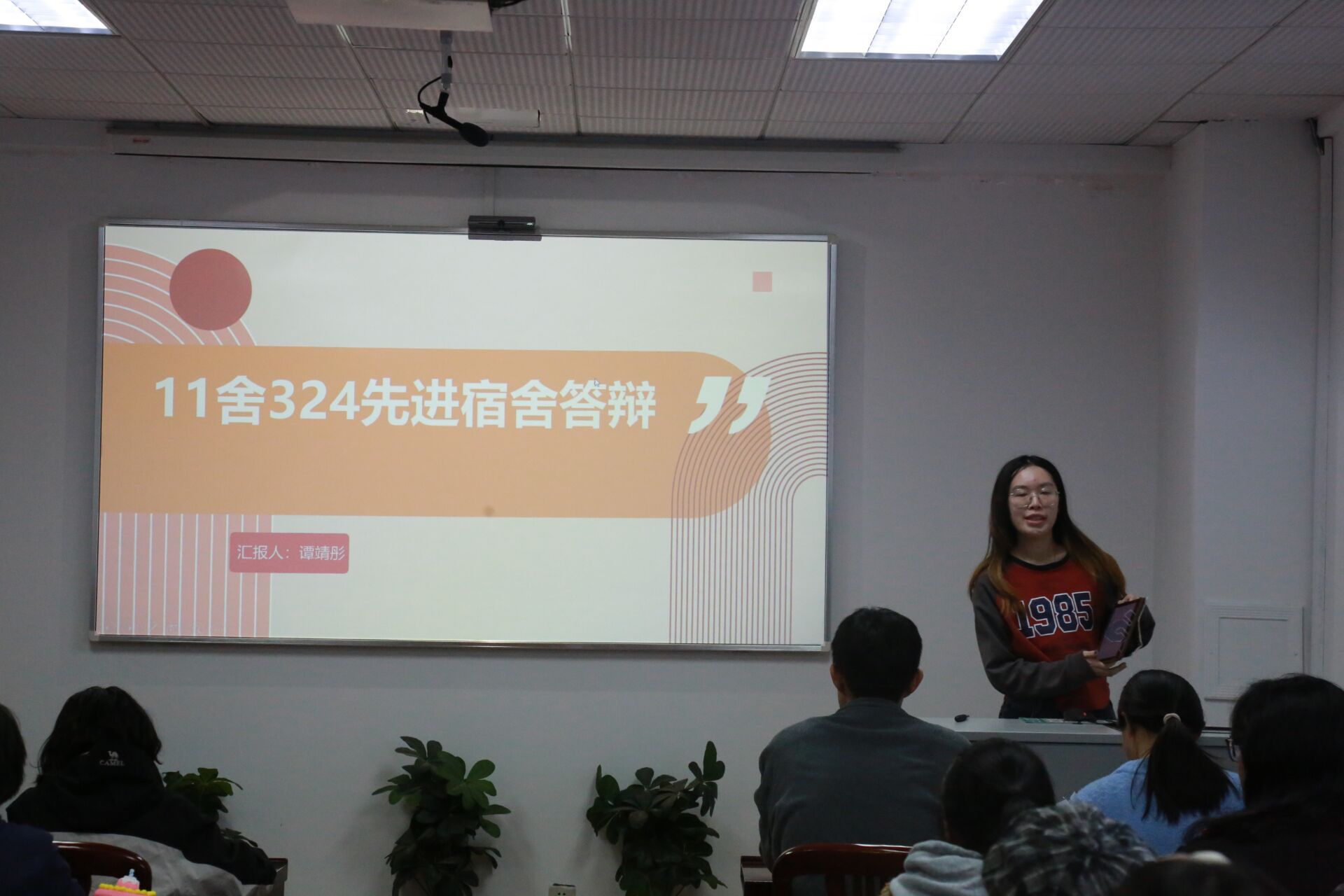在评选过程中,各宿舍长依次上台,通过PPT展示、视频播放以及现场讲解等多种形式,生动展现了她们各具特色的寝室风貌。从成员概况到获奖荣誉,每一个细节都透露出寝室成员之间的深厚情谊和积极向上的生活态度。