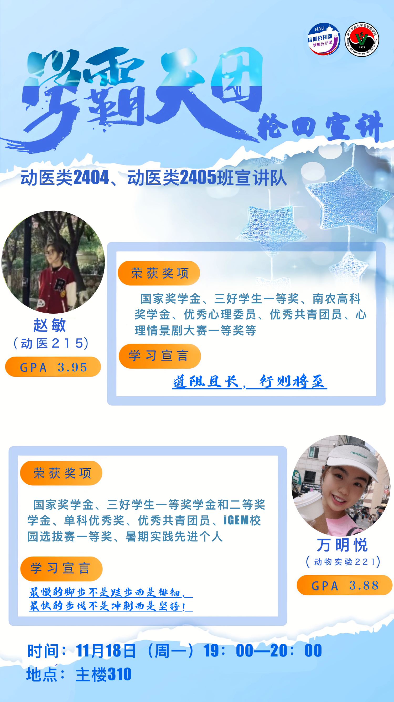 2024年11月18日,beat365唯一官方网站“学霸天团”轮回宣讲活动第一期成功举办。本次活动共邀请到动医213顾思洁、动医222毛维仪、动医215赵敏、动物实验221万明悦四名同学,为24级动医学子分享学习经验。
