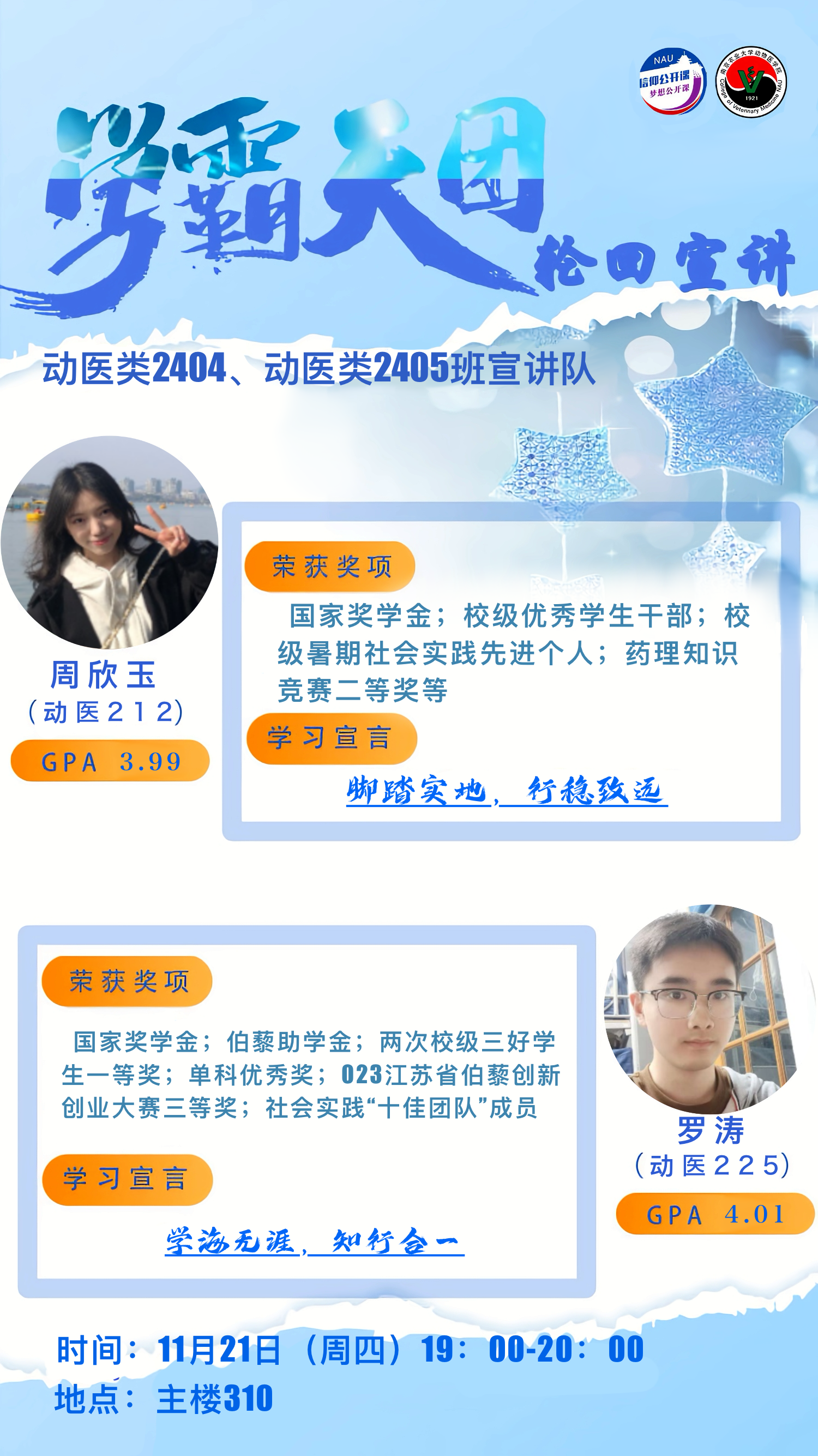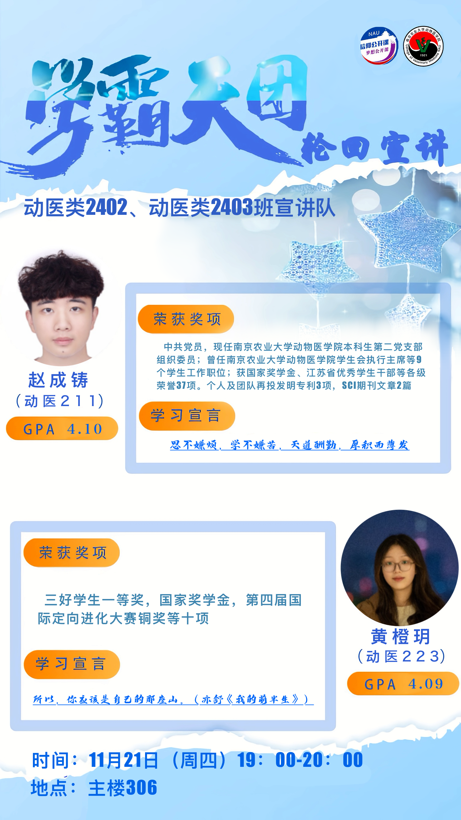 2024年11月21日,beat365唯一官方网站“学霸天团”轮回宣讲第三期成功举办。本期活动邀请到动医211赵成铸、动医223黄橙玥、动医212周欣玉和动医225罗涛四名同学,为24级动医学子们分享自己的学习经验。