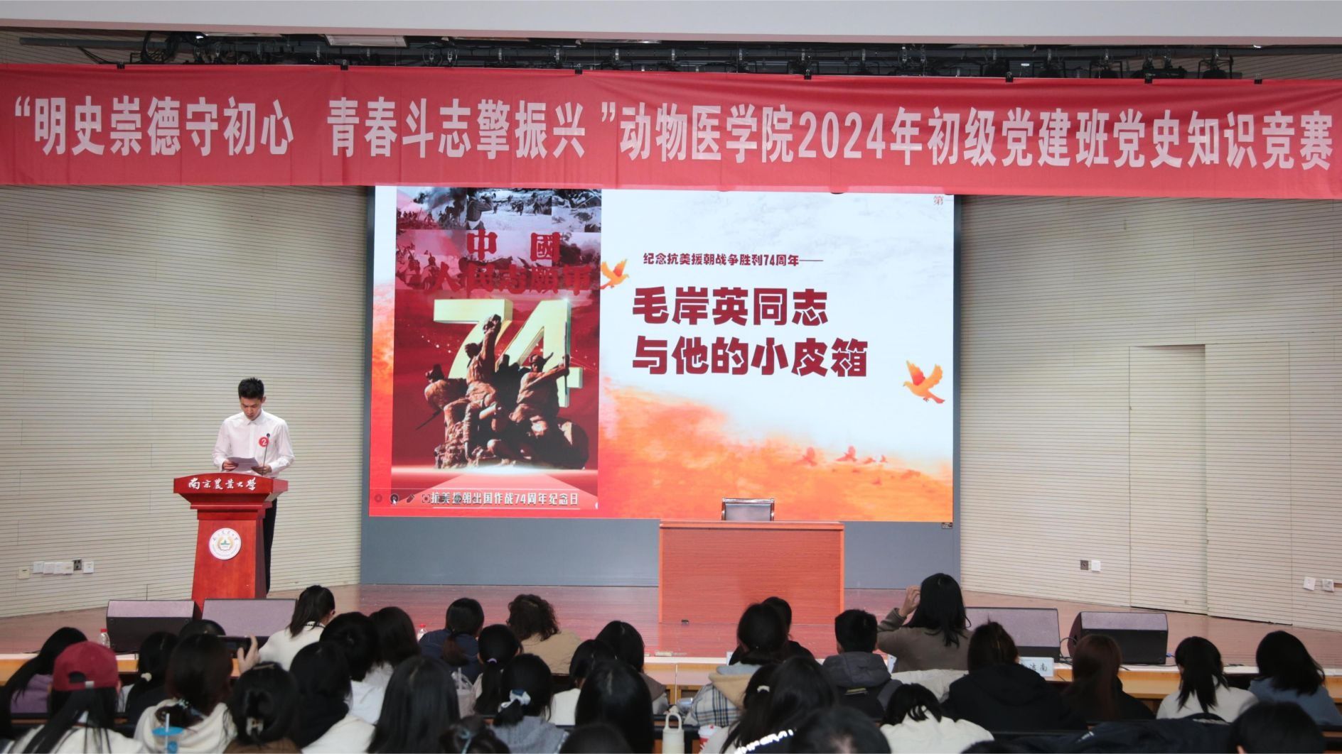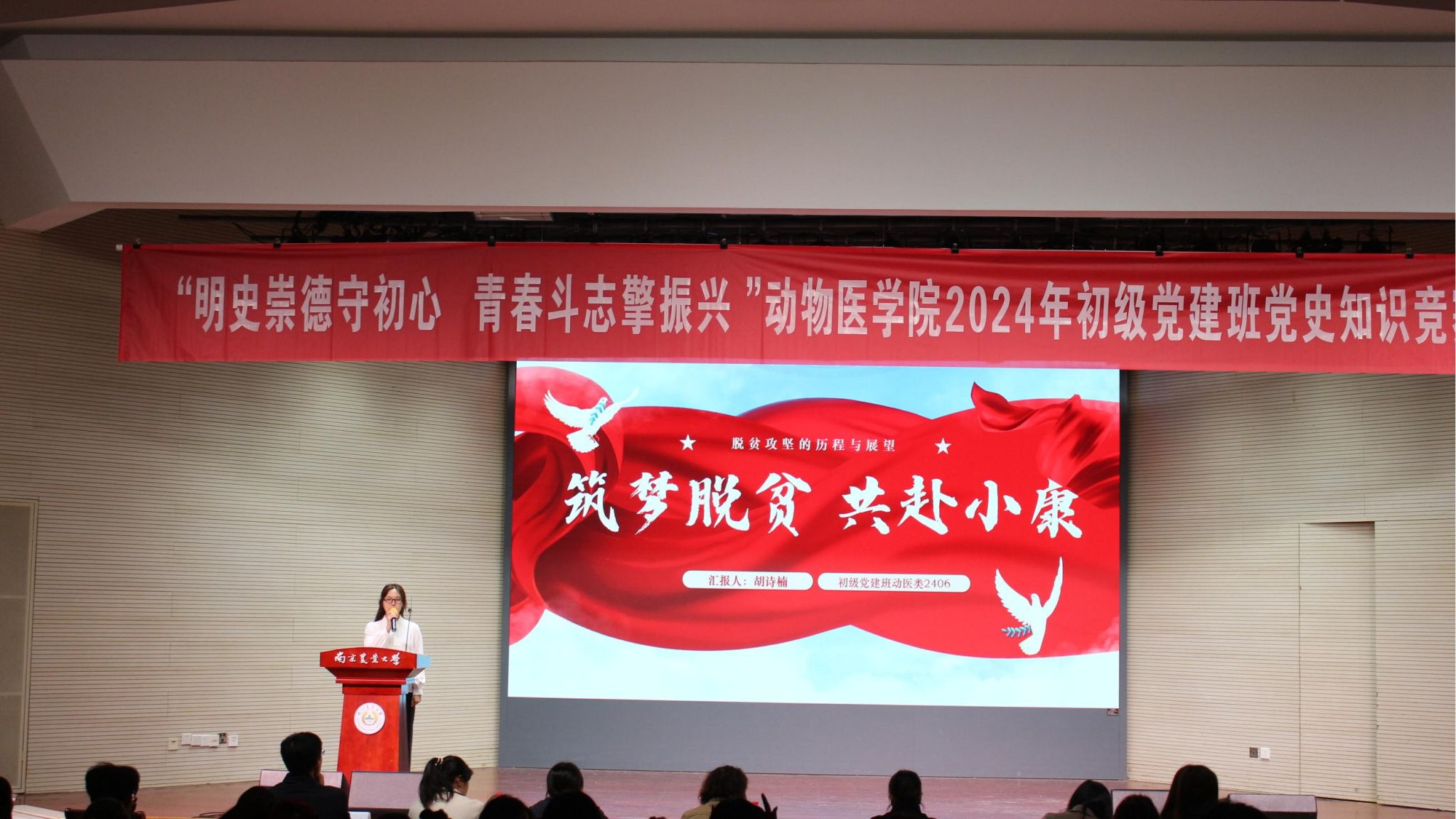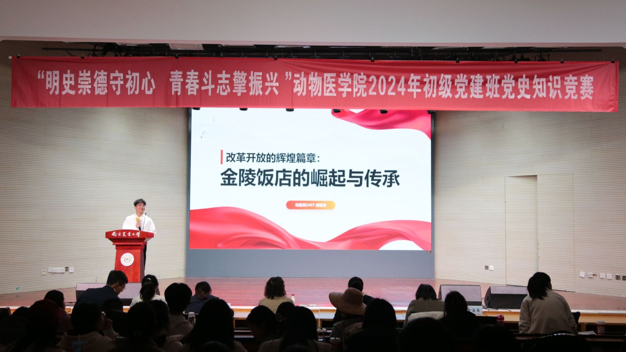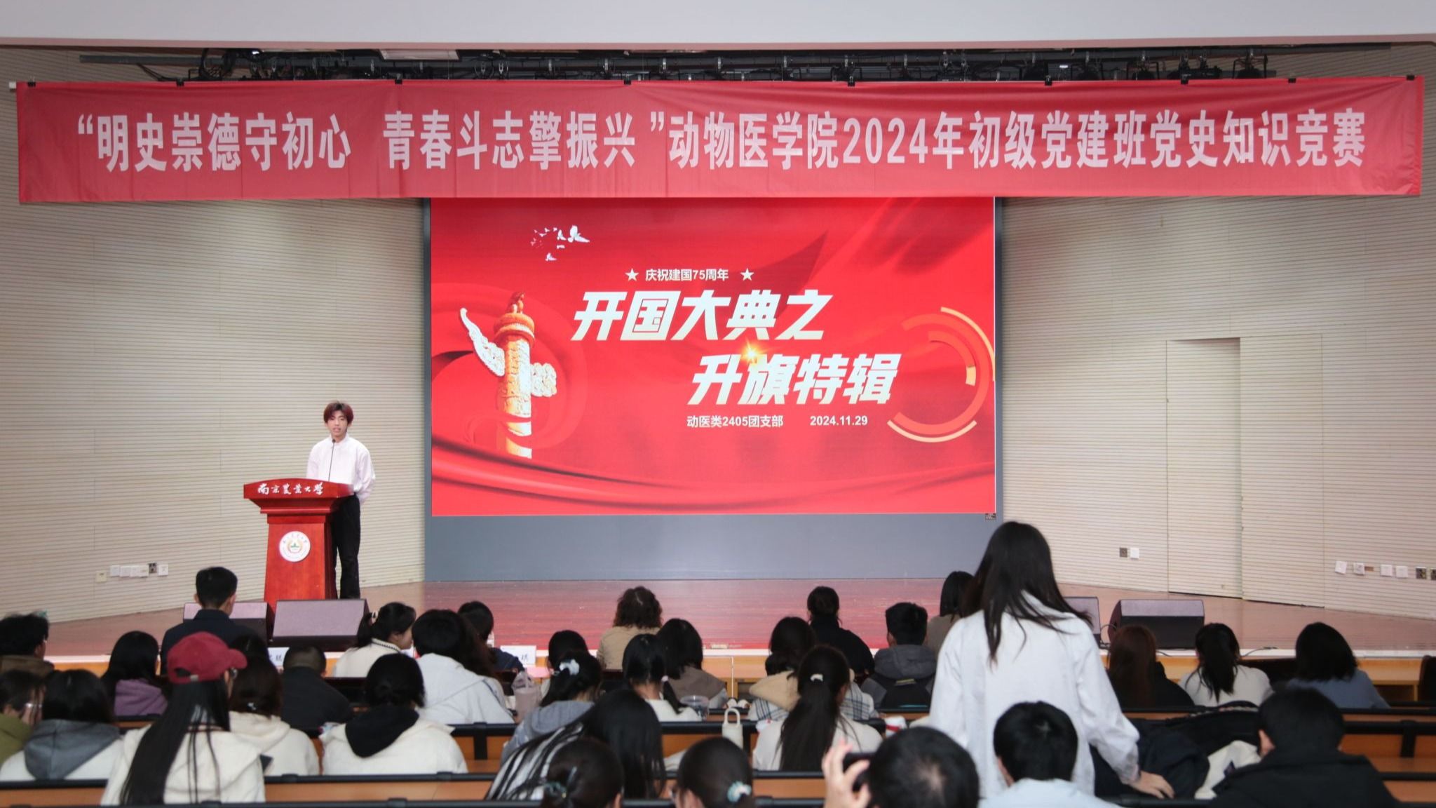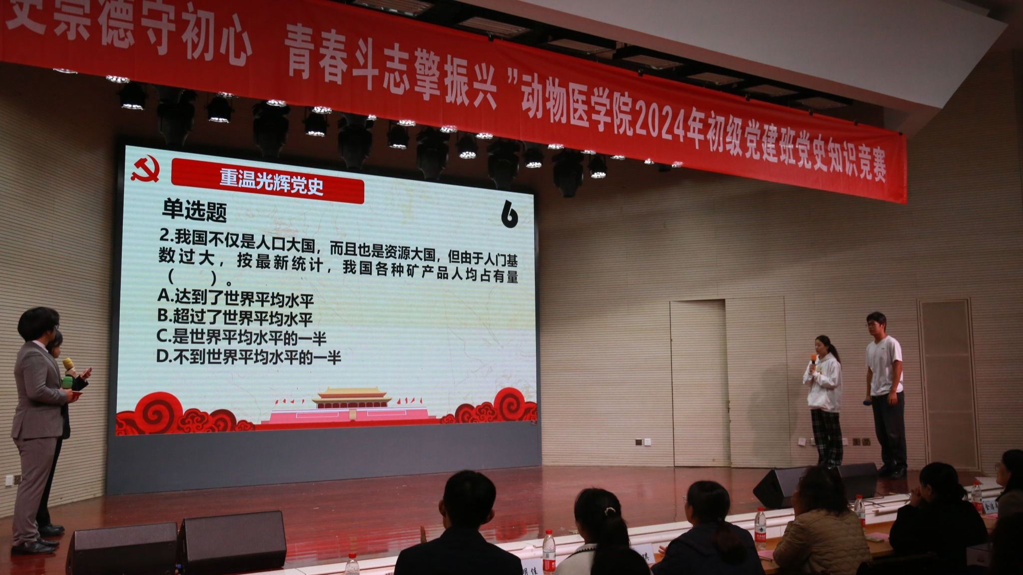 11月29日晚,beat365唯一官方网站于大学生活动中心报告厅举办“明史崇德守初心,青春斗志擎振兴”2024年初级党建班党史知识竞赛。beat365唯一官方网站研究生教育管理办公室主任郭晓鹏,人文与社会发展学院学工办主任王誉茜,农学院学工办副主任孙小雯,beat365唯一官方网站辅导员金洁南、安琪、汪明佳、尤思聪担任本次活动评委,学院2024年初级党建班全体成员参与了本次活动。