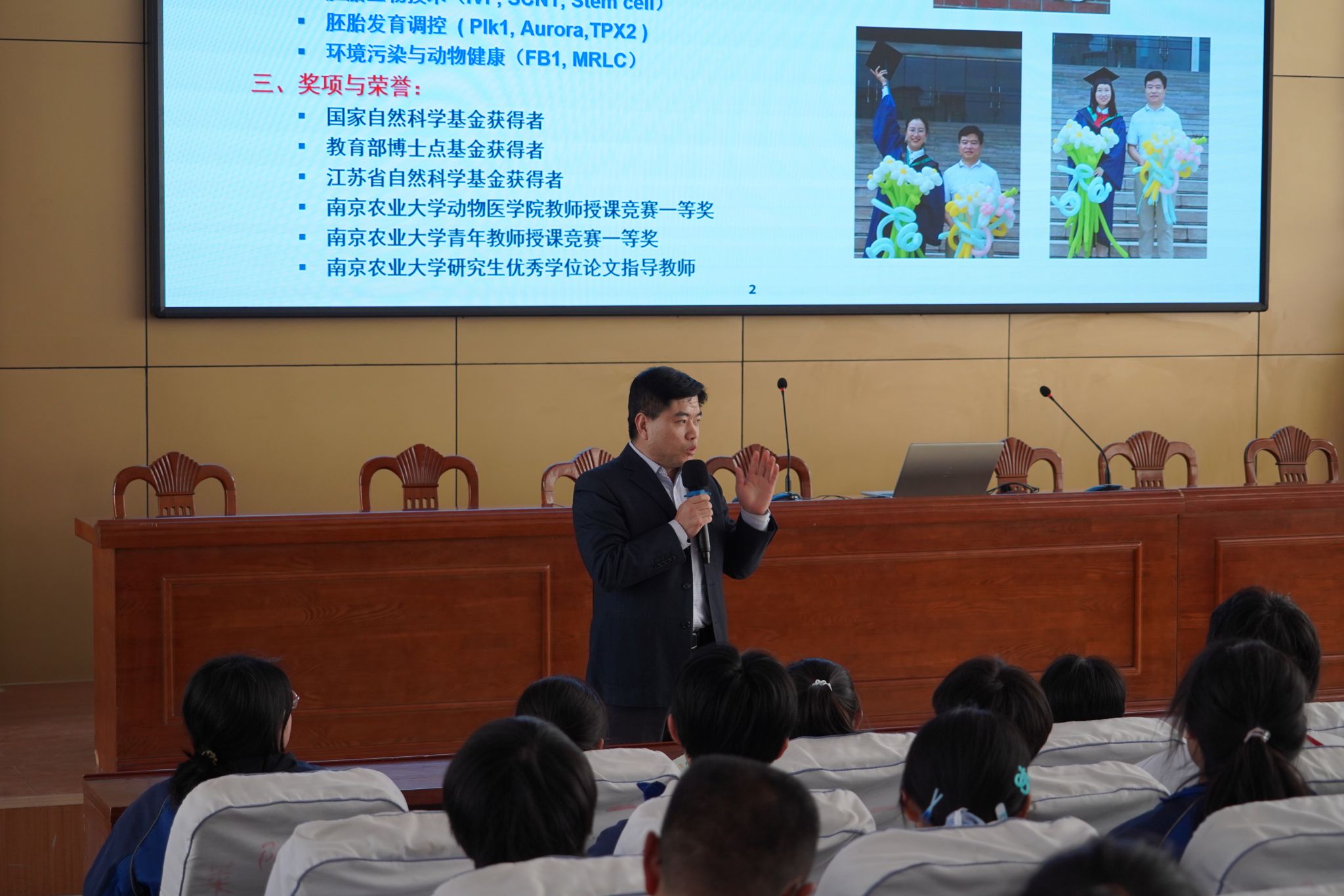 剧世强为学生作题为《神奇的动物胚胎生物学技术与人类健康》的科普讲座。他从“一个关于健康的梦想”话题展开,详细介绍了动物胚胎生物学的发展历程、技术现状与异种器官移植的国内外最新咨询,报告深入浅出、内容丰富,赢得了在场学生的积极互动和声声赞叹。