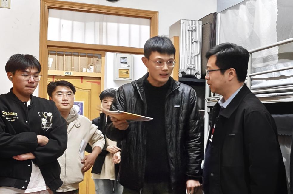 走访过程中,学院领导与老师们仔细查看了寝室用电设施、消防通道及公共区域安全情况,叮嘱同学们务必增强安全意识,规范用电,杜绝安全隐患。马喆副院长和姚敏磊副书记亲切询问同学们的学业进展、生活适应情况及实际困难,尤其关注低温天气下的防寒保暖与健康防护。辅导员和班主任老师们也结合各年级特点,围绕期末备考、科研实践、职业规划等话题与同学们展开交流,现场氛围温馨融洽。