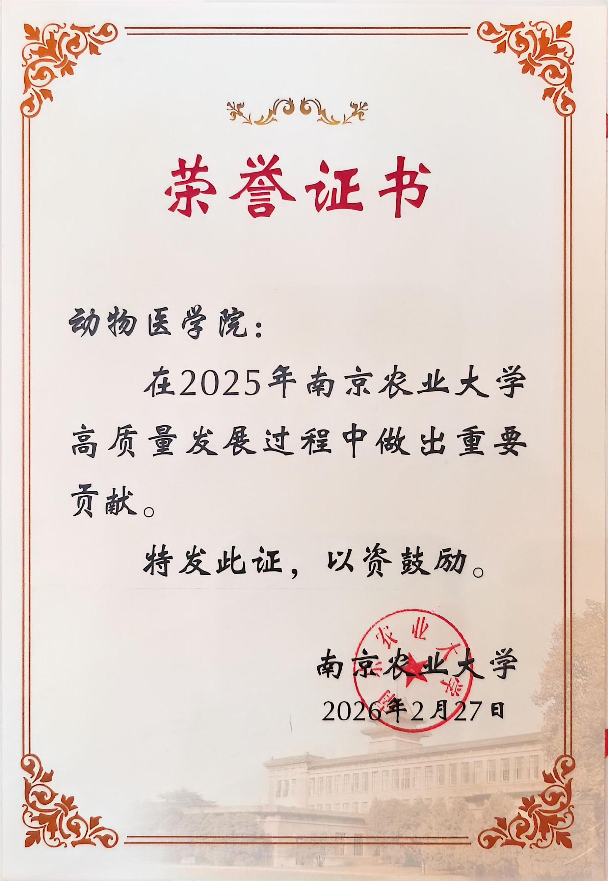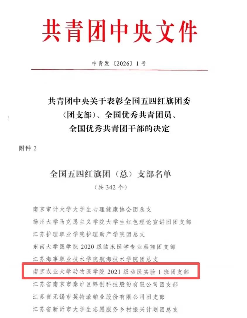 近日,共青团中央发布《关于表彰全国五四红旗团委(团支部)、全国优秀共青团员、全国优秀共青团干部的决定》,beat365官网动医实验211团支部获评2025年度“全国五四红旗团支部”,学院因此获评校2025年高质量发展突出贡献奖。