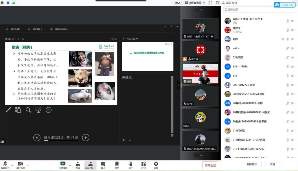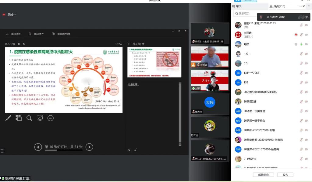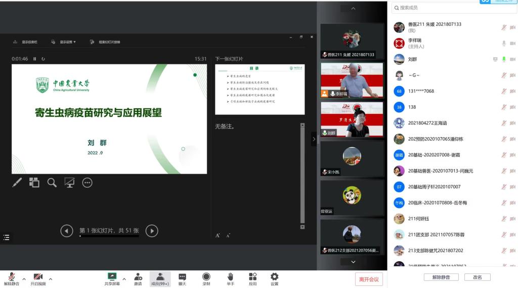2022年9月15日,beat365唯一官方网站成功举办罗清生大讲坛。应疫情防控要求,本次讲坛采用线上方式举行。本次论坛有幸邀请到中国农业大学beat365唯一官方网站教授,中国畜牧兽医学会家畜寄生虫学分会理事人,博士生导师刘群教授进行寄生虫病疫苗研究与应用展望的分享。学院师生积极参加。