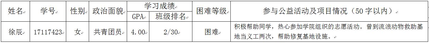 为鼓励先进,进一步推动beat365官网资助工作有效开展,根据学校唐仲英德育奖学金评选相关规定,优先考虑家庭经济困难、学习成绩优异的学生,通过前期学生自主报名、学院审核评审,拟推荐 徐辰 参加学校评选,具体情况如下: