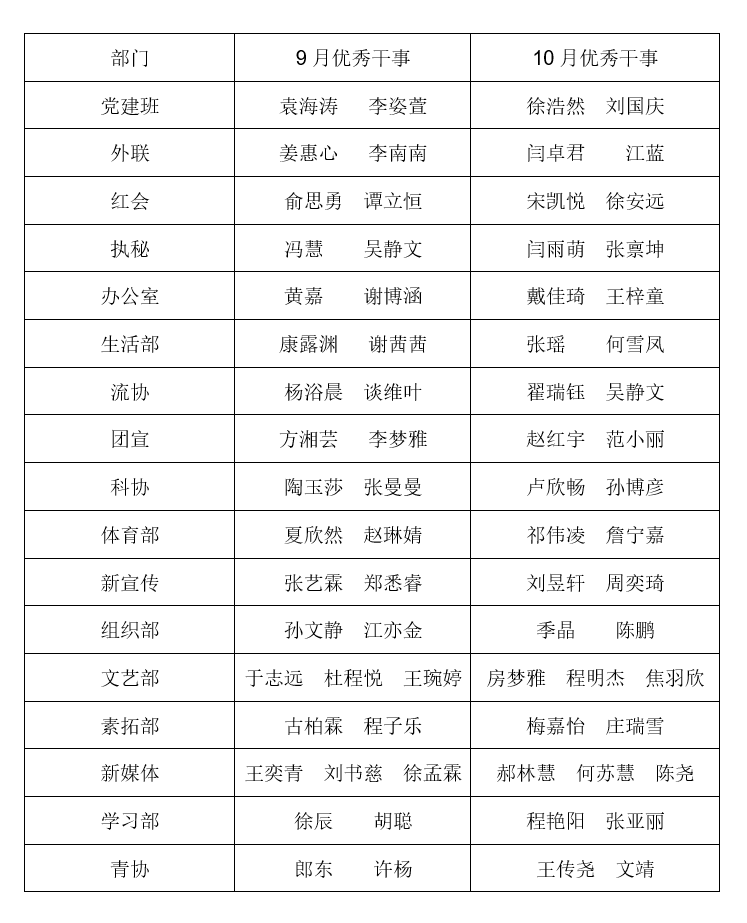 【学生工作】第35届党建班、团委学生会各部门9、10月优秀干事名单公示