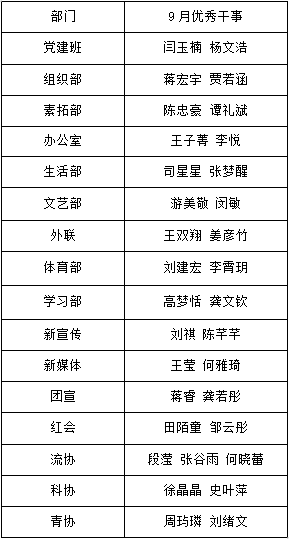 【学生工作】第36届党建班、团委学生会各部门9月优秀干事名单公示