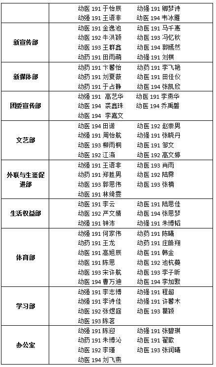 beat365唯一官方网站党建班、团委、学生会在学院党委领导和学院团委的指导下,以“服务于学院建设发展,服务于学生成长成才”为宗旨,用心打造“医者仁心,和谐家园”的品牌文化,协助老师顺利完成各项学院学生工作,决定开展beat365唯一官方网站第三十七届党建班、团委、学生会各部门干事招新活动。结合beat365唯一官方网站第三十七届党建班、团委、学生会各部门的实际情况,本着公平公正公开的原则,在经过个人申请、考核面试、综合考量之后,现将第三十七届beat365唯一官方网站党建班、团委、学生会干事名单公示如下: