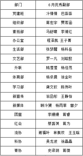 【学生工作】第36届党建班、团委学生会各部门6月优秀副部名单公示