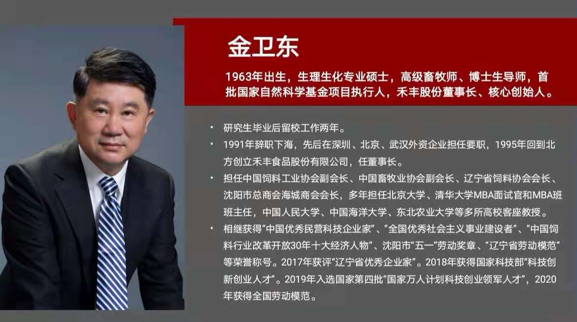 金卫东,1963年出生,生理生化专业硕士,高级畜牧师、博士生导师,首批国家自然科学基金项目执行人,禾丰股份董事长、核心创始人。