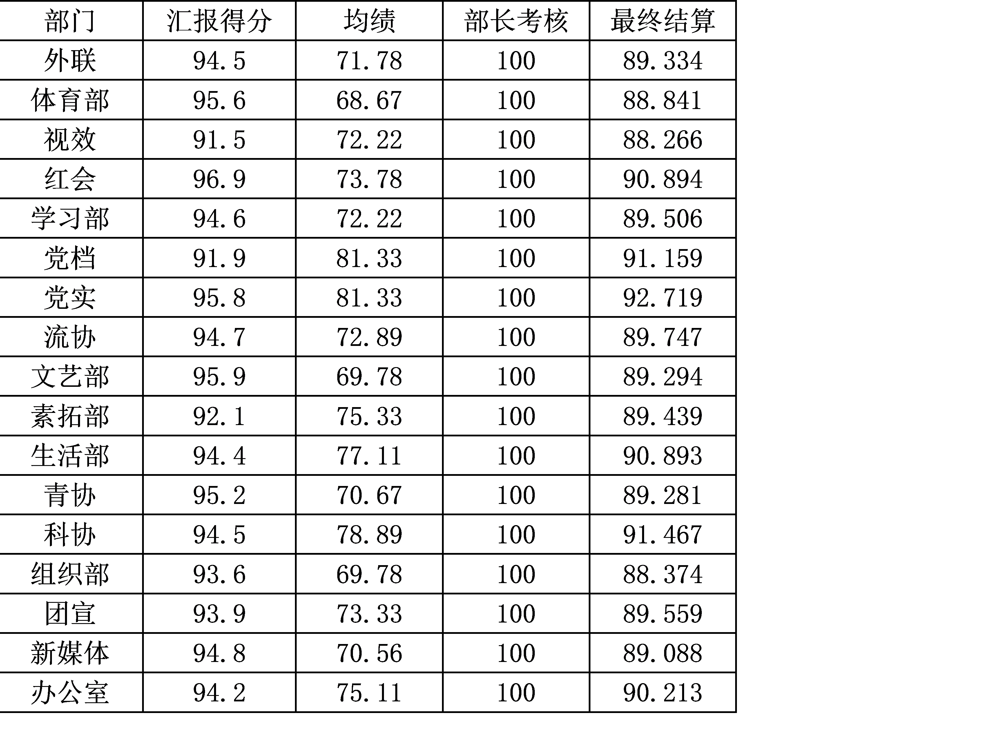 根据beat365官网党建班、团委、学生会部门考核方法,各部门经部门考核、部长答辩、成绩折算等考核方式进行打分,得分经过统计汇总,现将考核结果以以公示,公示期为2021年12月22日至2021年12月24日,如有异议,请于2021年12月24日18:00前反馈到办公室处。