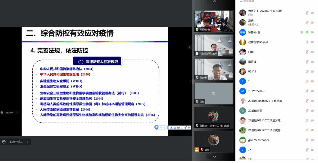 夏咸柱院士从新冠病毒感染与流行和综合防控有效应对疫情两方面进行分享,夏院士介绍道:由新型冠状病毒(SARS-CoV-2)感染所引起的新冠肺炎(COVID-19)造成世界大流行,严重威胁人类生命健康和世界的经济发展,查明病毒的来源是有效防控其疫病的基础,新冠病毒的溯源尤为重要,而且新冠病毒可感染犬科、猫科、鼬科以及非人灵长类动物,这些易感动物的多少直接关系到该病原的根除,需要加强监测;目前出现多种新冠突变株,针对新冠病毒变异与传播的疫情形势,要外防输入、内防反弹、不断完善防控政策,做到完善机制,联防联控,加强研究,科学防控,健全法规,依法防控。