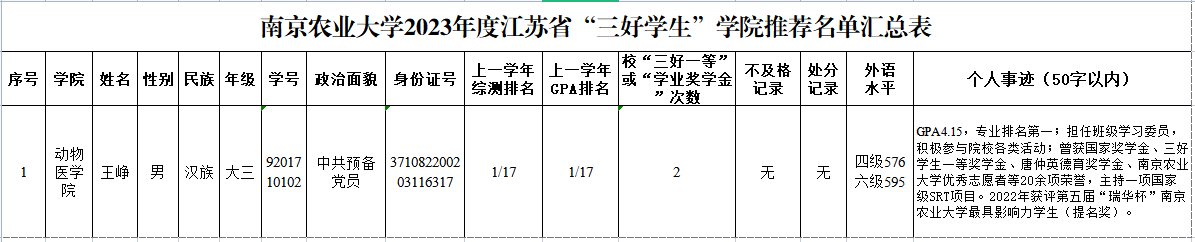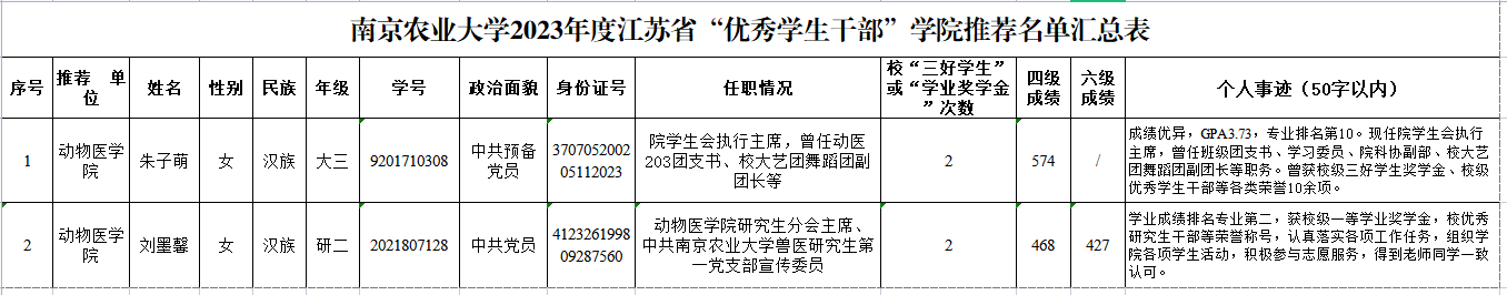 根据《关于推荐2023年省级三好学生、优秀学生干部、优秀毕业生和先进班集体的通知》的有关规定,经过个人申报、材料审核、学院团委讨论的基础上,评选结果公示如下: