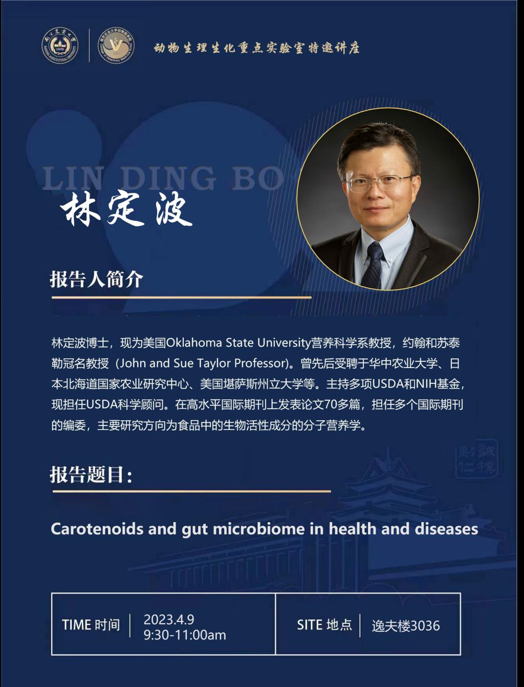 【学术报告】动物生理生化重点实验室特邀讲座-Carotenoids and gut microbiome in health and diseases