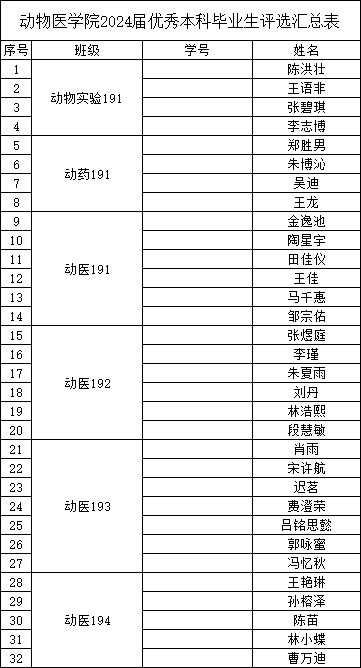 根据《关于开展2024届优秀本科毕业生评选工作的通知》,经个人申报、材料审核、班级评选,现将评选结果公示如下:
