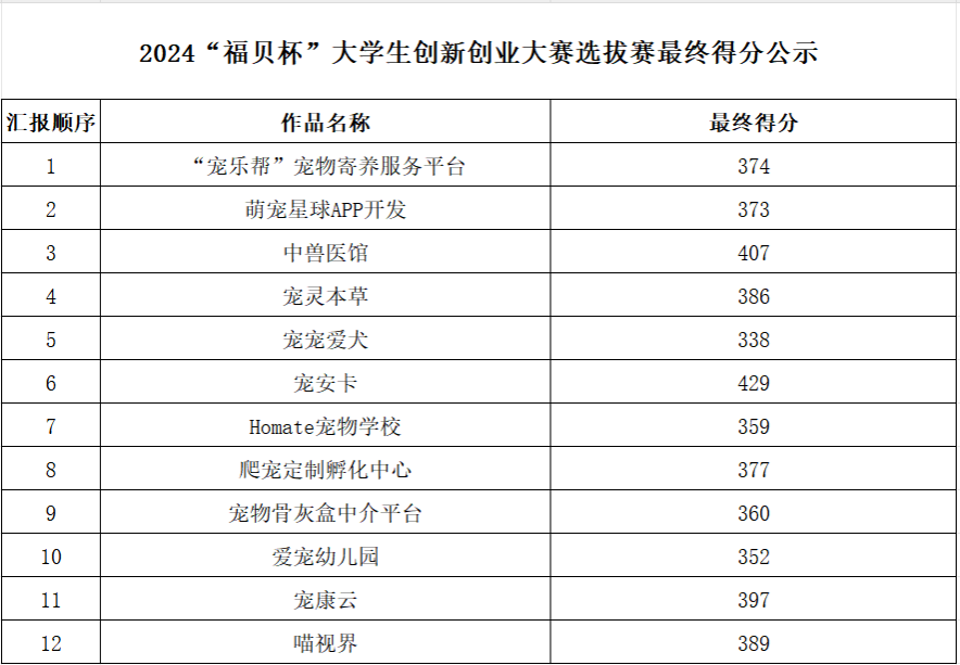 经过团队报名、作品初筛、复赛现场答辩,最终获得2024“福贝杯”大学生创新创业大赛校区选拔赛——南农站的队伍,信息公示如下: