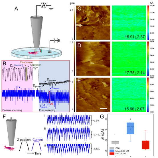 乳腺癌是威胁女性健康的主要恶性肿瘤,也是犬猫最常见的恶性肿瘤,其治疗研究一直备受关注。研究团队发现,在肿瘤细胞恶性转化过程中,细胞膜电生理特性的改变往往被忽视,而这恰恰是影响肿瘤细胞行为的关键因素。为此,团队创新性地采用具有纳米级分辨率的扫描离子电导显微镜(SICM)技术,首次实现了活细胞表面电荷分布的精准监测。