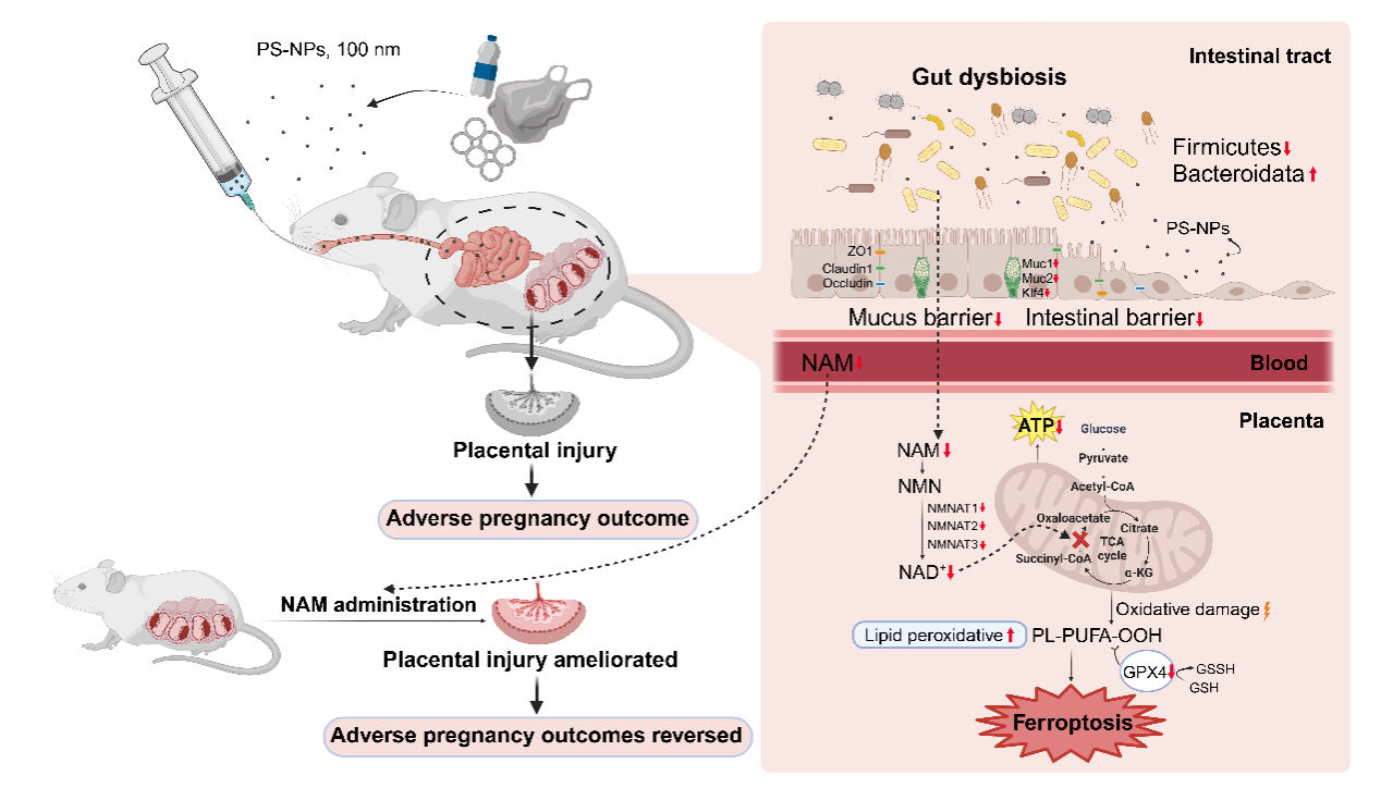 胎盘作为连接母胎、负责物质交换的关键临时器官,其结构与功能完整性对胎儿发育至关重要。该研究通过构建妊娠小鼠PS-NPs暴露模型,结合多组学研究发现PS-NPs可破坏母鼠肠道菌群结构,导致乳酸杆菌等有益菌减少,进而引发肠道屏障损伤和氧化应激。更重要的是,这些变化通过“肠-胎盘轴”传递,影响胎盘功能,具体表现为烟酰胺代谢紊乱、NAD+水平下降、ATP合成不足,最终诱发胎盘铁死亡及胎儿生长受限。粪菌移植试验进一步证实,受体小鼠出现与PS-NPs处理组孕鼠类似的胎盘损伤和胎儿生长受限。而外源性补充烟酰胺则能显著改善胎盘代谢功能,提升NAD+水平,缓解氧化应激,从而逆转PS-NPs暴露所致的不良妊娠结局。