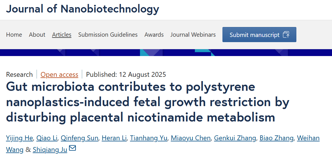 近日,beat365官网剧世强教授团队在动物生殖毒理学领域取得重要进展,研究成果Gut microbiota contributes to polystyrene nanoplastics-induced fetal growth restriction by disturbing placental nicotinamide metabolism在国际权威学术期刊《Journal of Nanobiotechnology》(IF=12.6,2024年)上正式发表。该研究首次从“肠-胎盘轴”视角,系统揭示了妊娠期暴露于聚苯乙烯纳米塑料导致不良妊娠结局的新机制,并创新性地提出烟酰胺(NAM)干预可有效改善胎盘代谢紊乱与氧化损伤,为防治塑料污染带来的生殖健康风险提供了全新的科学依据和潜在的营养干预策略。