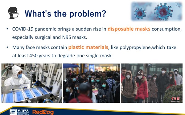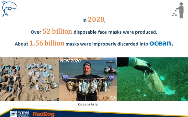 我们都知道口罩可以预防病毒和其他微生物给我们带来健康。但是在过去的一年里,COVID-19大流行导致一次性口罩消费量突然上升。其中很多口罩都含有塑料材料,比如聚丙烯,尤其是医用口罩和N95口罩,至少450年才能被降解。去年生产的一次性口罩超过520亿个,其中15.6亿个被不当丢弃到海里。我们从口罩的生产商研发新的可降解材料,媒体宣传正确处理口罩方式,垃圾处理,兽医救助被口罩影响的动物,建立安全监测方法来检测海洋中微塑料的检测和识别标准。