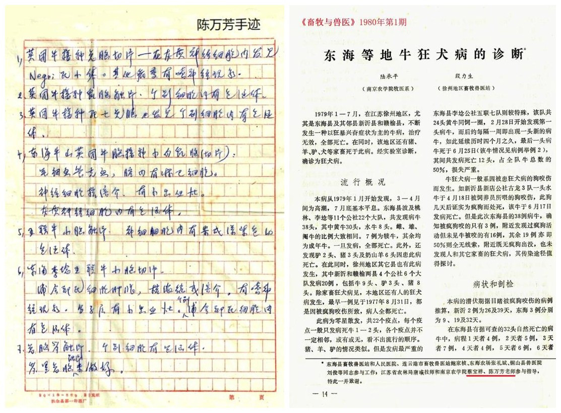 1979年1至7月,江苏省徐州地区的东海县、新沂县一定数量的耕牛发病,开始怀疑消化系统的问题,对症治疗无效。上报疫情,南农在南京复校不久,蔡宝祥老师得到邀请,出马北上,因为我在东海县兽医站工作多年,情况熟悉,带我同往。根据流行病学调查、临床诊断的结果,怀疑是狂犬病。当时狂犬病在国内已经绝迹多年,而且传染源不清楚,所以诊断特别谨慎。蔡老师让我取回病料,接种家兔及小白鼠,病牛、死兔及死鼠做病理切片,请陈先生镜检,在上述三种动物的脑组织内,均发现狂犬病特有的包涵体,因此明白无误得出结论,此病为狂犬病。