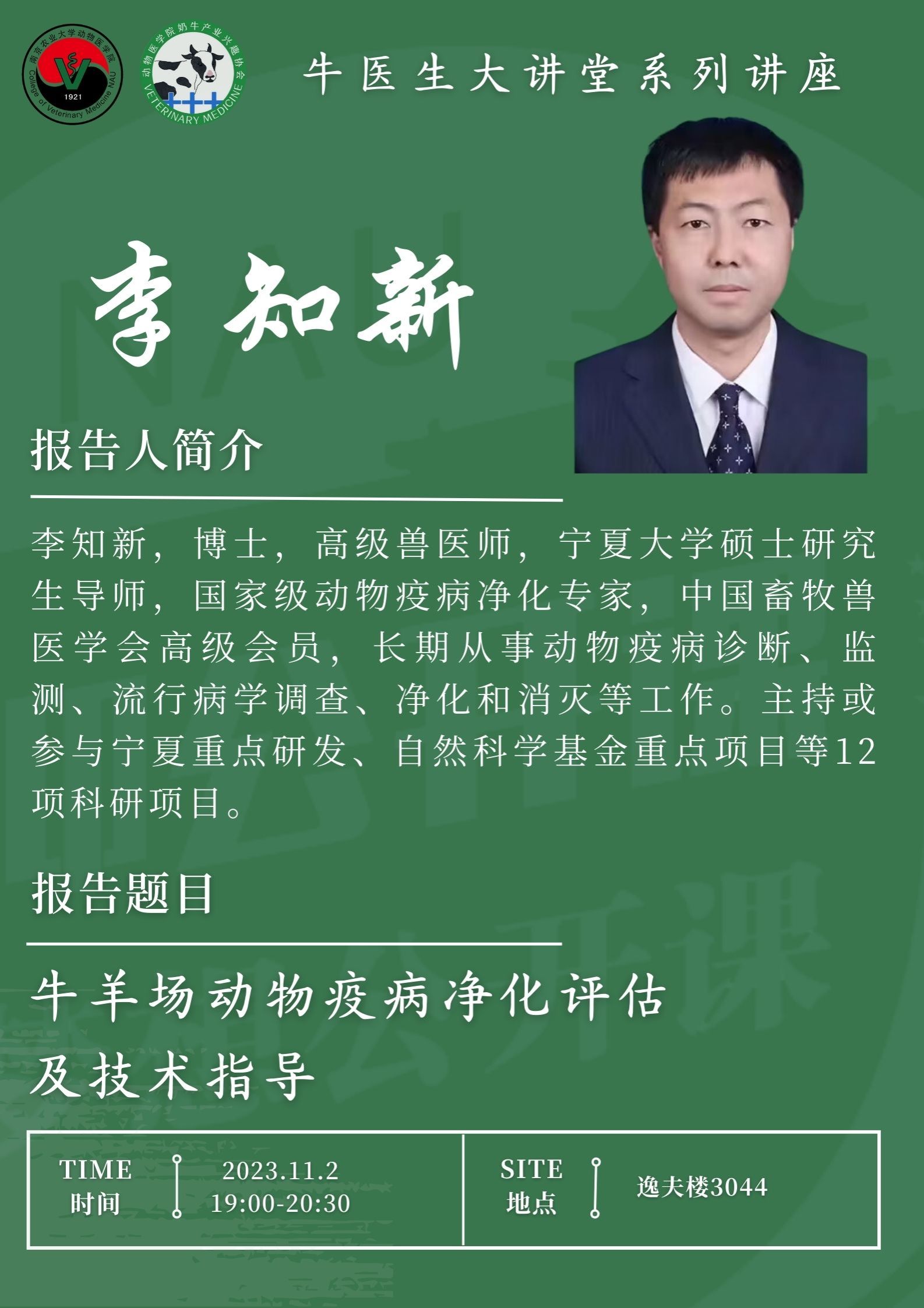11月2日晚,beat365唯一官方网站2023年“牛医生大讲堂”专题培训第3期在逸夫楼3044如期举行。本次培训主题为“牛羊场动物疫病净化评估及技术指导宣讲”,由宁夏回族自治区动物疾病预防控制中心高级兽医师李知新主讲,吸引了百余名学生参加。