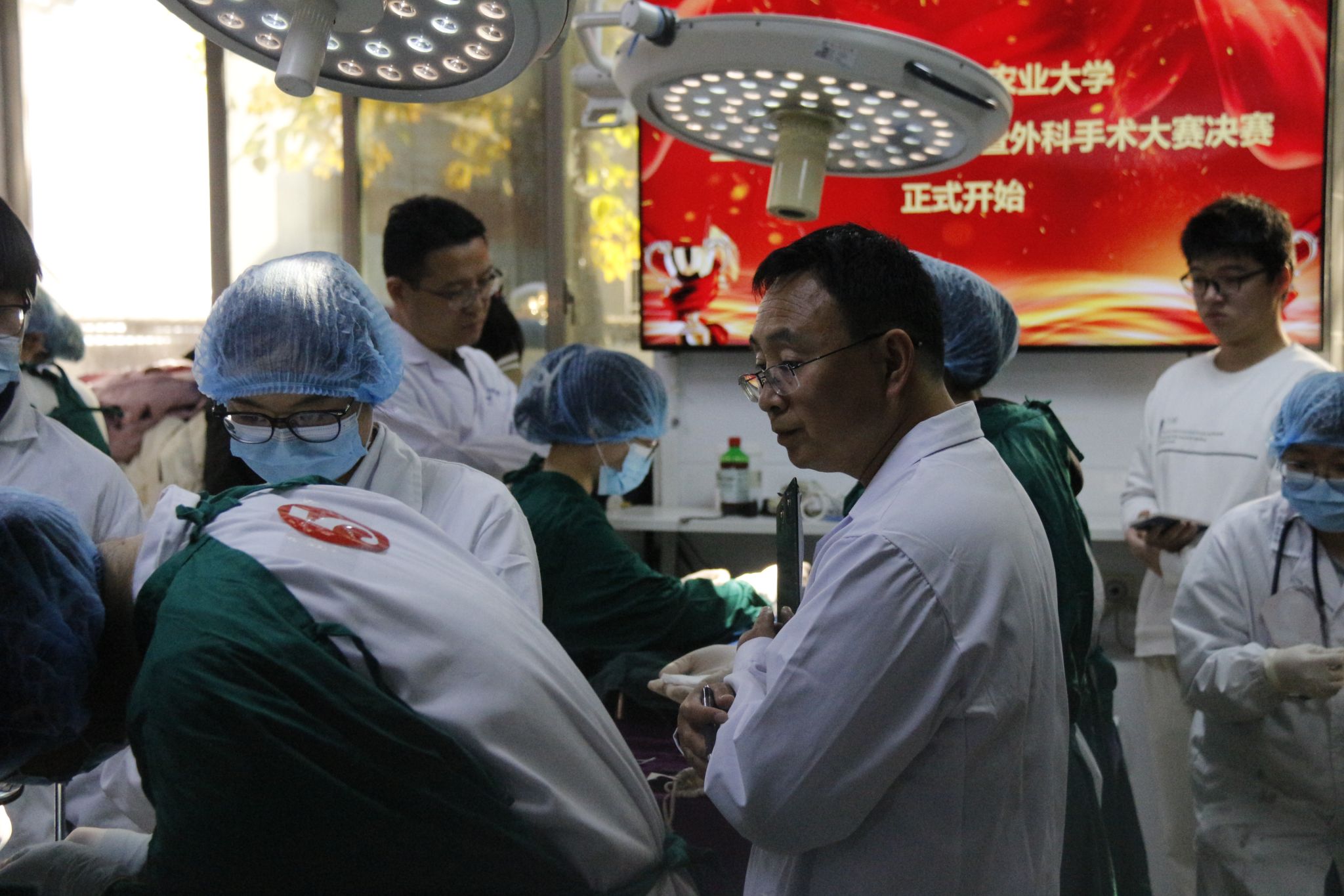 下午,兔的胃切开手术正式拉开帷幕。选手们迅速进入状态,执手术刀于兔腹壁上精准切口,细致探查胃部情况并完成缝合。这不仅是对外科实操能力的全面考核,更是团队协作精神与冷静应对能力的生动体现。评委老师们全程巡视,认真为每一位选手的表现打分。