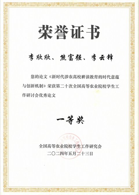2024年李欣欣、熊富强、李云锋老师论文获第二十次全国高等农业院校学生工作研讨会优秀论文一等奖