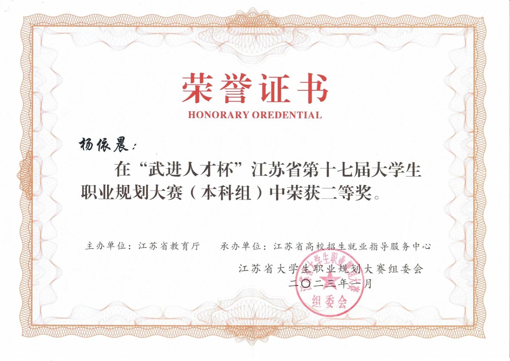 2023年杨依晨获江苏省第十七届大学生职业规划大赛本科生组二等奖