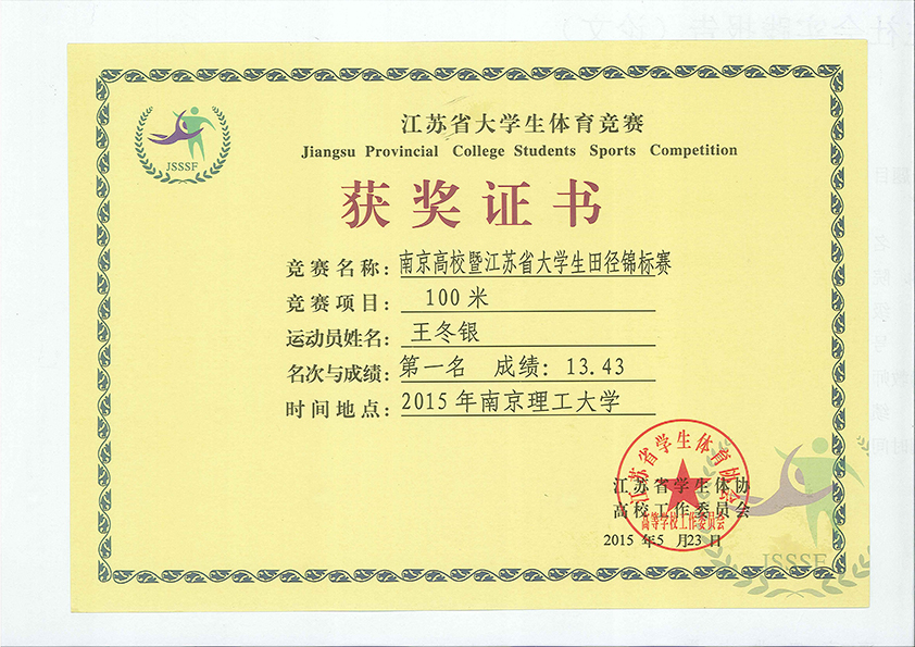 王冬银获江苏省体育竞赛第一名
