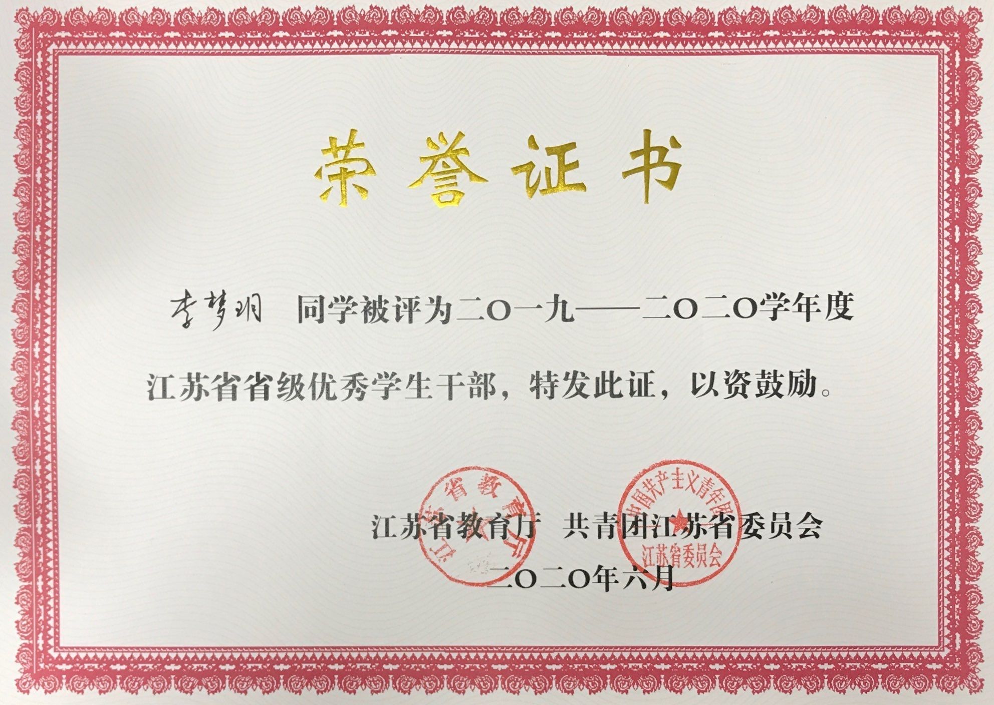 2019-2020年度李梦玥省级优秀学生干部