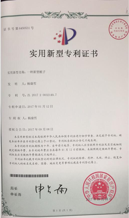 杨康哲获国家实用新型专利证书