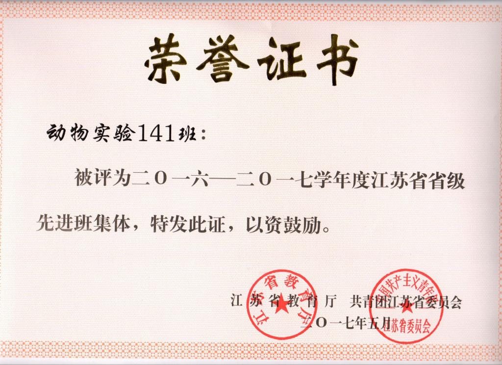 动物实验141获评江苏省省级先进班集体
