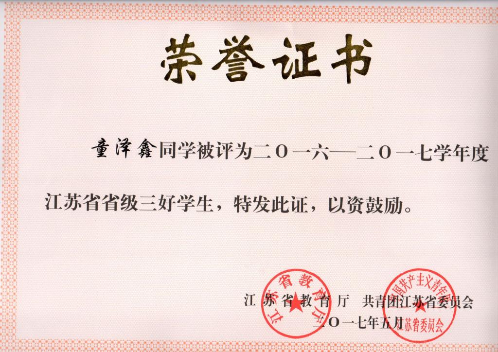 童泽鑫获江苏省省级三好学生