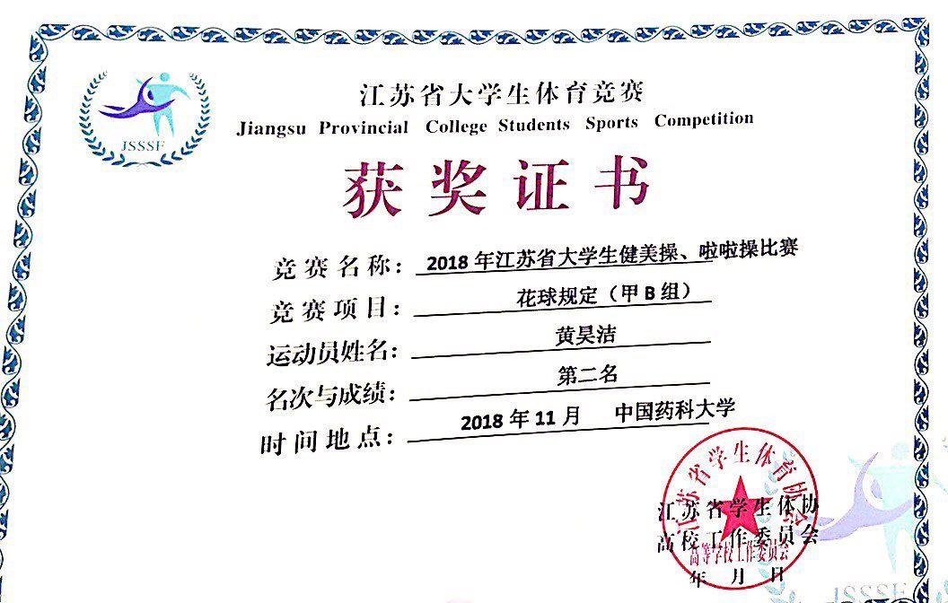 黄昊洁获江苏省大学生健美操、啦啦操比赛花球规定(甲B组)第二名