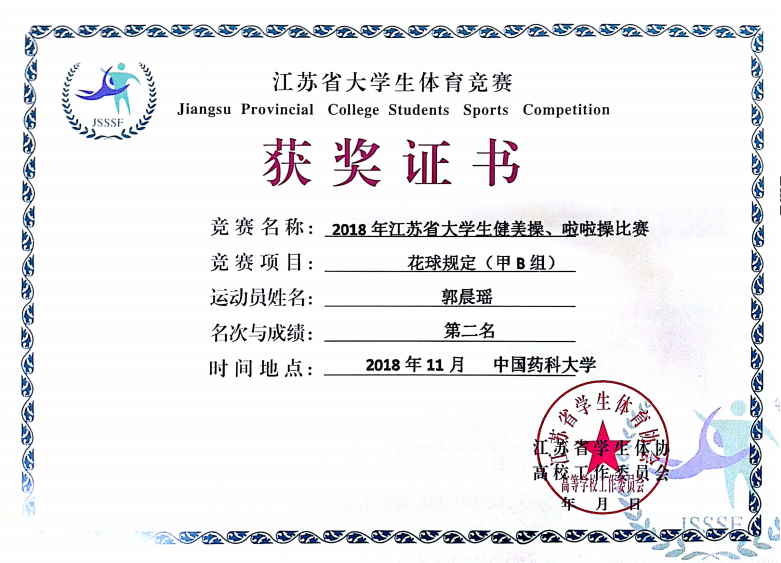郭晨瑶获江苏省大学生健美操啦啦操比赛花球甲B组第二名