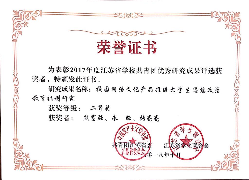 《校园网络文化产品推进大学生思想政治教育机制研究》获江苏省学校共青团优秀研究成果二等奖