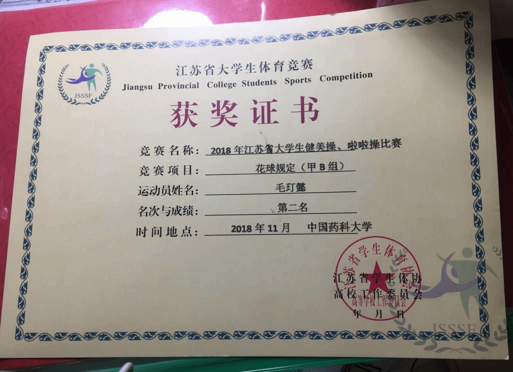 毛玎懿获2018年江苏省大学生健美操、啦啦操比赛花球规定(甲B组)第二名