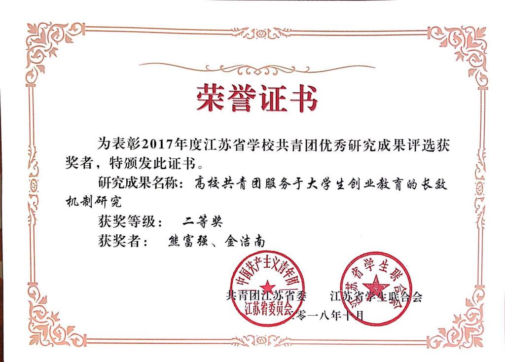 《高校共青团服务于大学生创业教育的长效机制研究》获江苏省学校共青团优秀研究成果二等奖