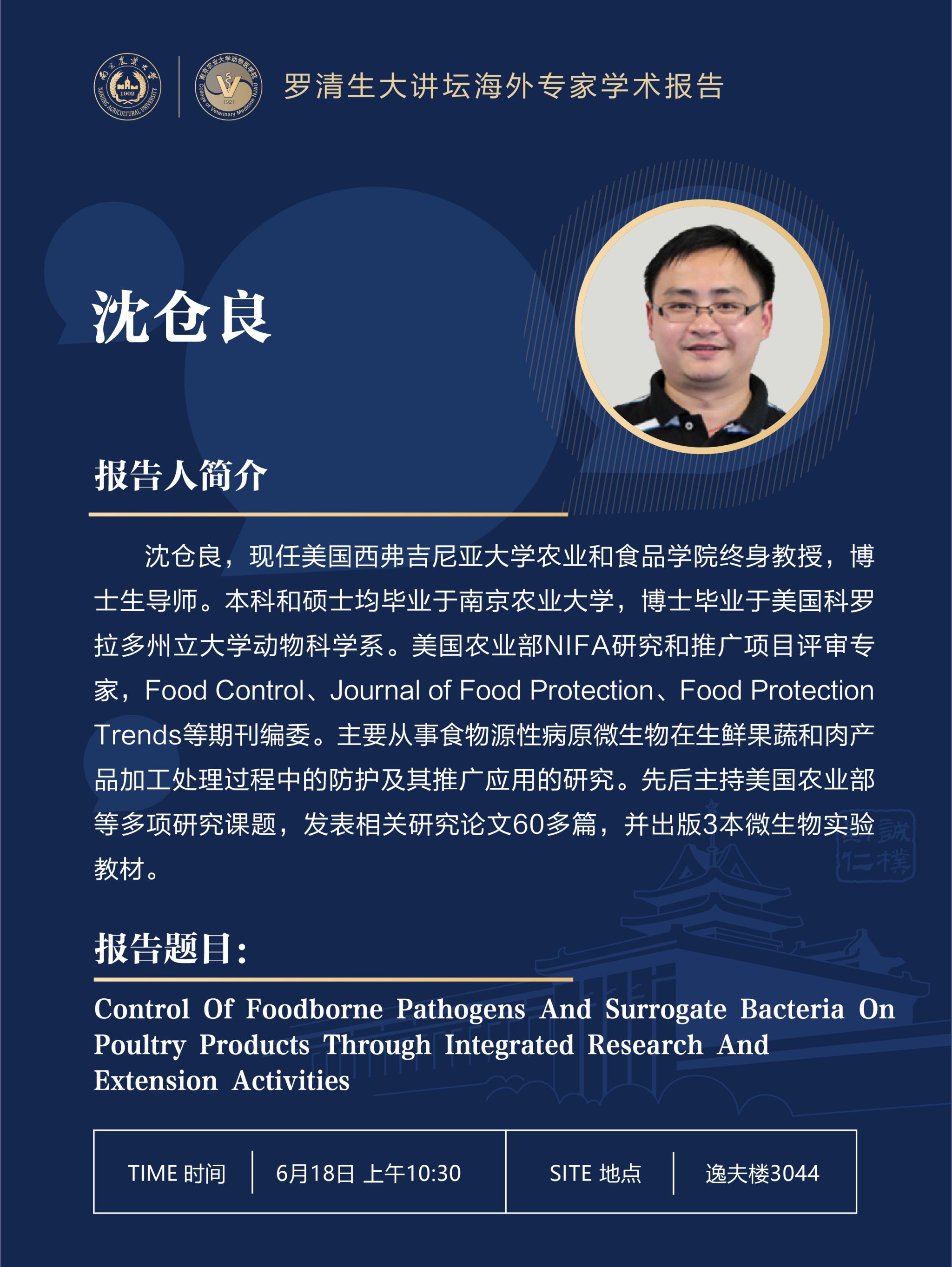 【罗清生大讲坛海外专家学术报告】Control of Foodborne Pathogens and Surrogate Bacteria on Poultry Products Through Integrated Research and Extension Activities