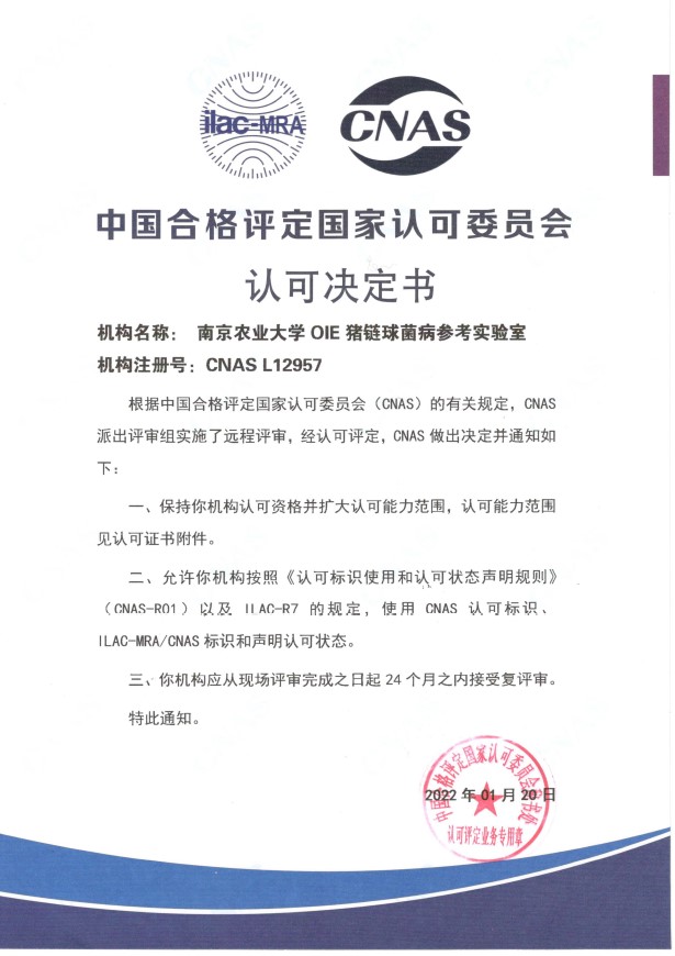 beat365唯一官方网站OIE猪链球菌病参考实验室通过CNAS复评审与扩项认可